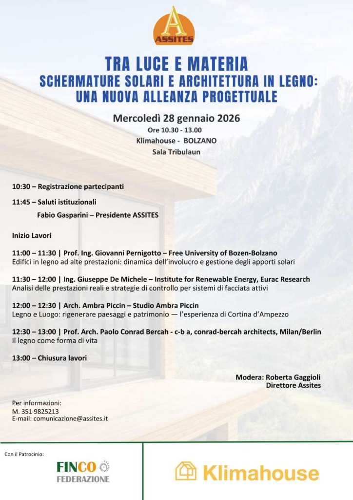 L’evento – in programma mercoledì 28 gennaio 2026, dalle ore 10.30 alle 13.00 presso la Sala Tribulaun di Fiera Bolzano – riunirà università, centri di ricerca, professionisti e imprese in un dialogo concreto sulle migliori strategie progettuali.Attraverso casi studio, esperienze progettuali e analisi tecnico-scientifiche, verranno approfonditi temi di grande valore strategico per l’edilizia sostenibile, con il contributo di relatori di primo piano come:
