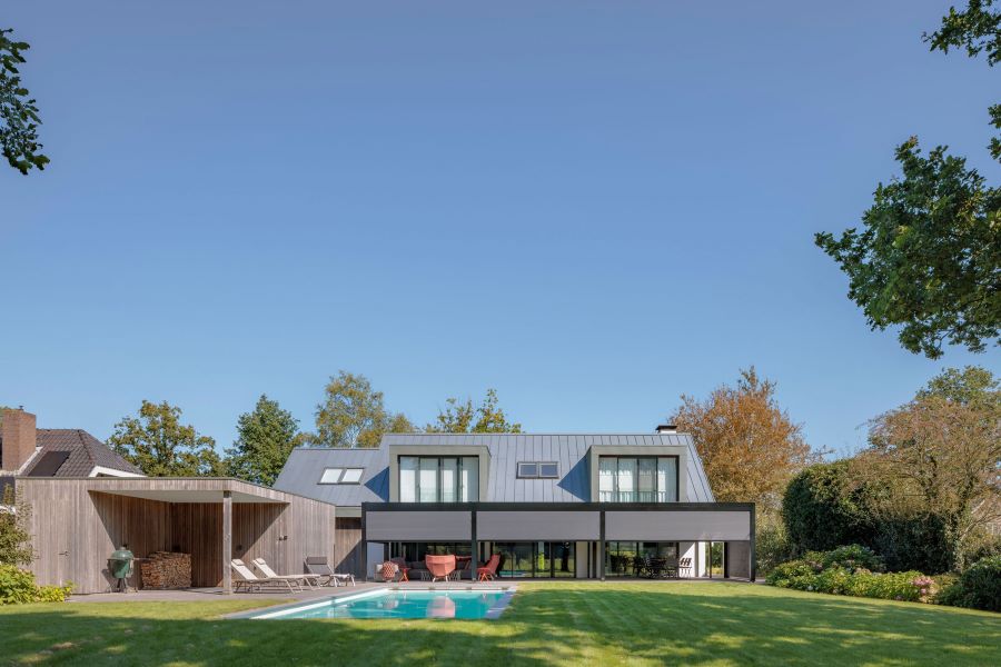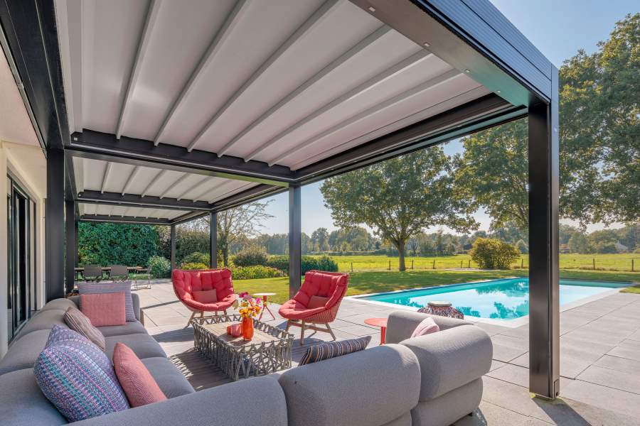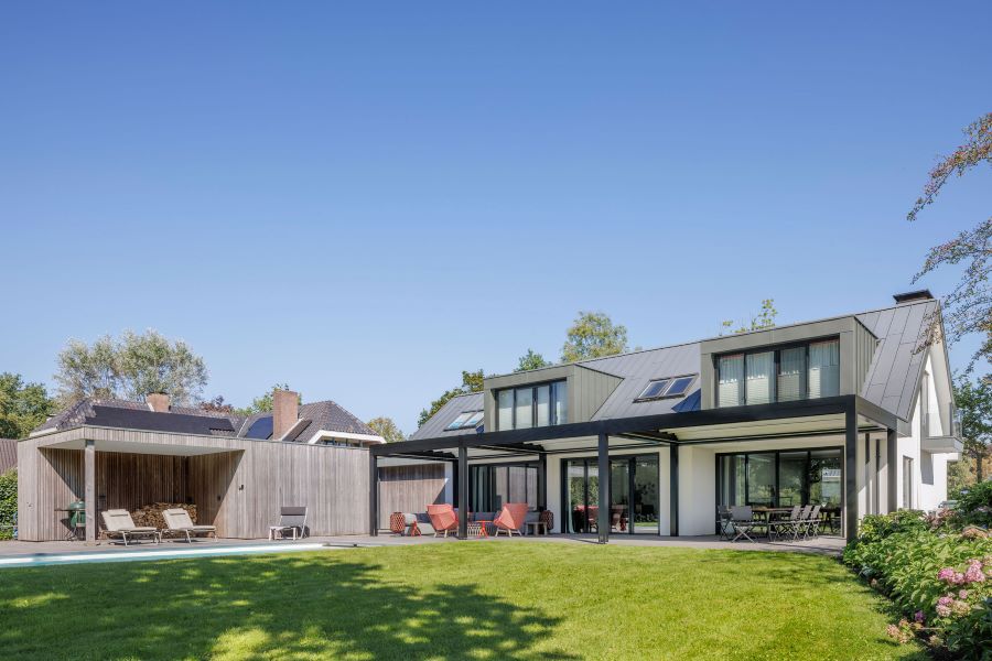 Grazie alla loro versatilità, nonché in conseguenza del cambiamento climatico, le pergole impacchettabili stanno oggi diventando un’apprezzata soluzione anche in paesi dal clima più rigido. È il caso di questa splendida abitazione unifamiliare, situata a Zwolle nei Paesi Bassi, che presenta, nella parte superiore, i caratteri tipici delle costruzioni olandesi – dalla copertura a falde molto spioventi ai generosi bow-window che rendono abitabili le camere nel sottotetto – mentre la parte inferiore si rivela simile a un’abitazione che potremmo trovare in Italia. Al pian terreno, lungo l’intero prospetto meridionale, si estende infatti una pergola impacchettabile Azimut di Gibus, ampia tre campate, che accoglie un’estensione all’aperto del living – con divano ad angolo, poltrone e tavolo basso, per il relax e la conversazione – e una zona pranzo con tavolo e sedute pieghevoli dall’immagine “outdoor”. Delimitati a ovest dal padiglione di servizio