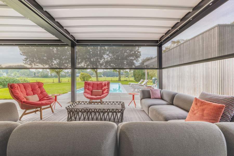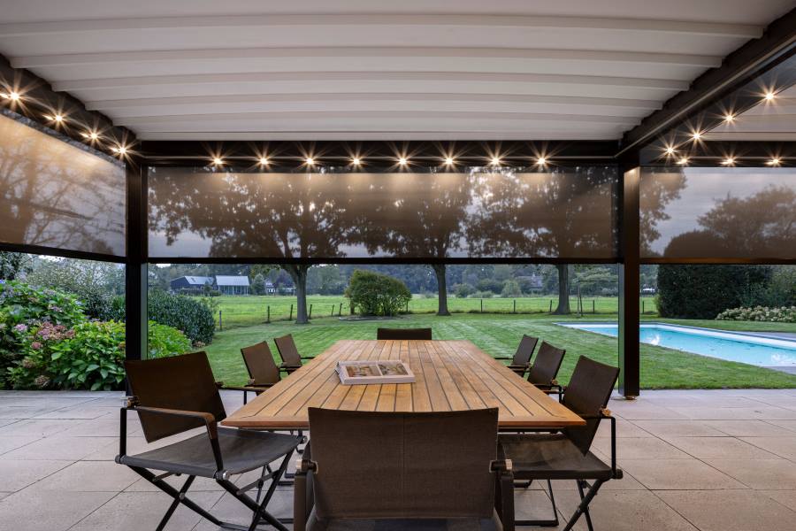 Ampi e attrezzati, gli spazi esterni di una residenza olandese dalla forte personalità estetica sono resi ancor più versatili, funzionali e suggestivi dalla pergola impacchettabile Azimut di Gibus, equipaggiata con punti luce LED e chiusure laterali in tessuto screen.