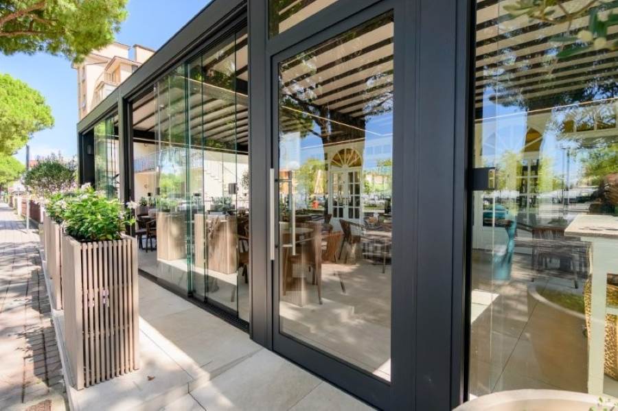 Per assicurare la massima protezione e permettere la fruizione del dehors anche nelle giornate più fredde o ventose, la pergola è stata completata con un sistema di chiusure all’avanguardia. Le vetrate panoramiche Line Glass creano un suggestivo effetto “tutto vetro” e garantiscono un’ampia visuale sull’esterno senza compromessi. Questo sistema scorrevole su binario, privo di profili perimetrali, non solo offre protezione da vento e rumore, ma amplifica la luminosità, favorendo un dialogo costante tra l’ambiente interno e il paesaggio circostante. A completare la configurazione, sono state installate le tende verticali Vertika Prime, che offrono ulteriore protezione solare e privacy, e due tende Antalia in una zona esterna aggiuntiva, che contribuiscono a creare delle zone d’ombra strategiche.