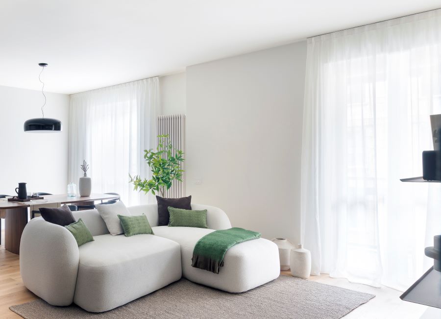 Negli ambienti principali, living e camera padronale, sono state invece scelte tende arricciate realizzate con tessuto Arrtex della collezione Mediterraneo (colore 14601), in tonalità bianca, azionate con binario a strappo. Una soluzione tessile più morbida e decorativa, capace di contribuire alla definizione di atmosfere luminose e raffinate.