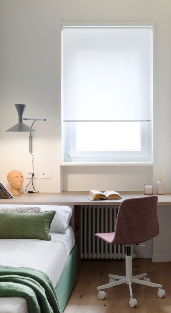 Per cameretta e bagno sono state installate tende a rullo modello F101 con struttura e accessori in colore bianco RAL 9010, progettate per integrarsi perfettamente con il design dell’ambiente circostante e contribuire a creare un’atmosfera di armonia e comfort visivo. Il tessuto scelto è il Colortex nella tonalità bianco naturale (cod. 37001), composto al 60% da Trevira e al 40% da PES. Ignifugo in Classe 1, presenta una resistenza alla luce pari a 6/7 su una scala da 1 a 8, garantendo durabilità e sicurezza e risultando ideale anche per ambienti domestici dinamici e contemporanei.