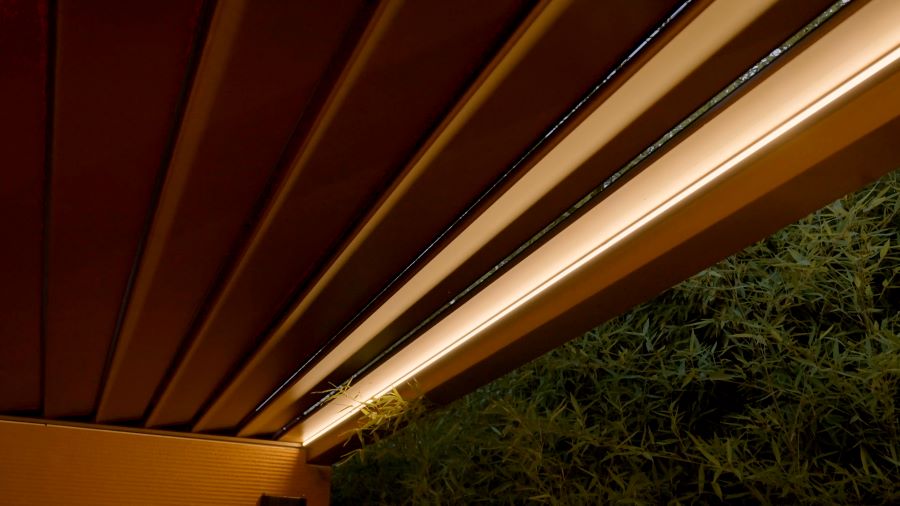 Questa pergola dispone infine di una vasta gamma di accessori che completano l’esperienza del comfort outdoor: illuminazione notturna con corpi LED spot da 3 W ciascuno, integrati nelle lame o nella cornice, o con led strip RGB applicati al perimetro della copertura; prese elettriche e usb inserite nei montanti; impianto audio con connessione bluetooth degli altoparlanti; impianto di nebulizzazione dell’acqua, per raffrescare in modo naturale lo spazio sottostante; telecomando per le regolazione a distanza di tutti i componenti; interfaccia wi-fi Gibus Connect integrabile al sistema domotico, con propri anemometro e sensori d’irraggiamento e neve/pioggia.